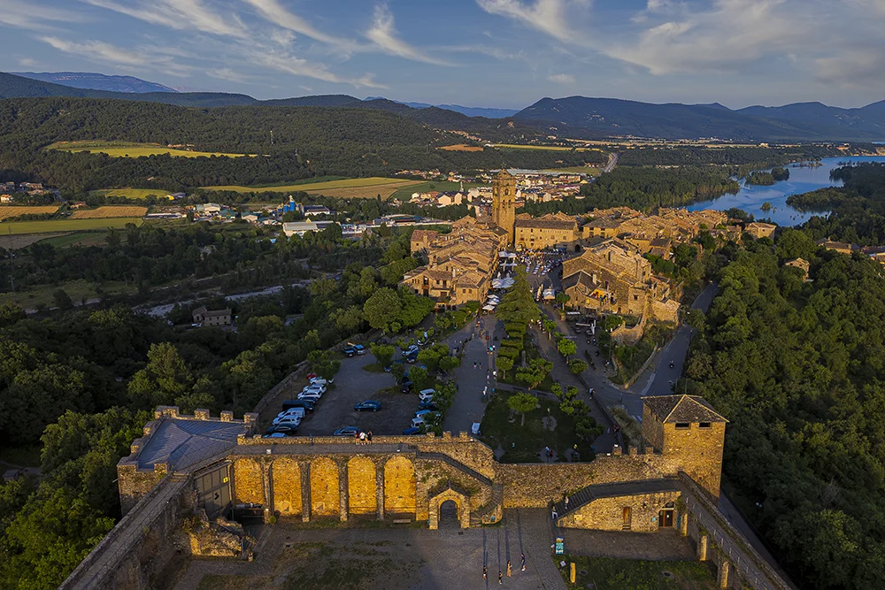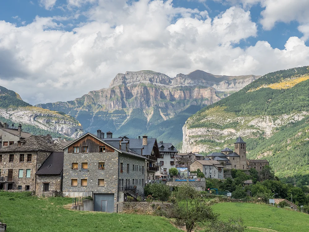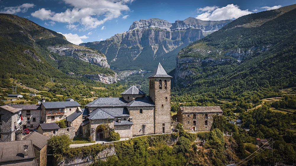 A primera hora de la mañana saldremos en dirección a los paisajes más emblemáticos del Pirineo aragonés. La primera parada del día la haremos en la basílica de Torreciudad, un impresionante santuario mariano situado en un entorno natural privilegiado, despejado sobre una colina con vistas espectaculares al embalse de El Grado y a las montañas de los Pirineos. El edificio, de arquitectura contemporánea pero perfectamente integrada en el paisaje, se inauguró en la década de los setenta sobre una antigua ermita medieval vinculada al siglo XI. Hoy en día es un importante centro de peregrinación y un espacio que invita al recogimiento y a la contemplación del paisaje. Continuamos el viaje hacia Aínsa, una de las villas medievales mejor conservadas de España. Tras almorzar en un restaurante local, descubrimos esta población situada en un enclave estratégico entre los ríos Cinca y Ara, a las puertas del Parque Nacional de Ordesa y Monte Perdido. Pasear por sus calles empedradas es hacer un auténtico viaje en el tiempo: durante nuestra visita conoceremos el castillo fortificado del siglo XI, testigo de la reconquista cristiana, y su espectacular plaza porticada, considerada una de las más bellas del Pirineo. También entraremos en la iglesia románica de Santa María, de una gran sobriedad y belleza, y en el Museo de las Artes y Oficios Tradicionales, donde conocemos cómo era la vida cotidiana en estas tierras de montaña y qué oficios han configurado el carácter de la comarca a lo largo de los siglos. Finalmente, llegaremos a nuestro confortable hotel, situado en los alrededores de Boltaña y a los pies del Parque Nacional de Ordesa. Cena y alojamiento en el hotel.