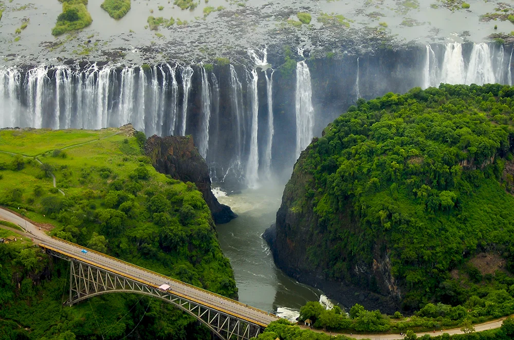 Después del desayuno iremos a visitar las cataratas (UNESCO) paseando por el camino que permite contemplar los saltos de agua y donde disfrutaremos de un espectacular paisaje. A continuación haremos un crucero por el río Zambezi para ver hipopótamos y cocodrilos y contemplar los hermosos paisajes de la orilla del río. Almorzaremos durante la navegación y por la tarde nos dirigiremos al aeródromo para empezar un vuelo en helicóptero sobre las cataratas Victoria, el cañón que hay a continuación y las aguas del río Zambezi. Terminada la visita dispondremos de tiempo libre para descansar o pasear por Victoria Falls. Cena y alojamiento en el hotel.