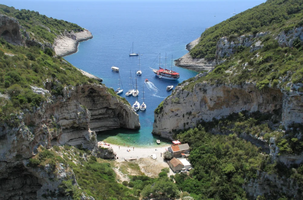 Desayuno y almuerzo a bordo. Una vez lleguemos a la isla de Bisevo iremos a conocer la conocida gruta Azul, de origen cárstico, donde los rayos de sol generan un espectacular efecto de luces y colores que dan origen a su nombre. Acabada la visita navegaremos de regreso a la isla de Vis donde fondearemos en una de las calas de la costa norte y dispondremos de tiempo para bañarnos y disfrutar del paisaje. Después de almorzar atracaremos en el puerto de Vis, y por la tarde pasearemos por los barrios de Kut y Luka, donde veremos la torre veneciana y el monasterio de San Jerónimo, y tendremos la posibilidad de subir hasta los restos de la torre británica de Torjun, del siglo XIX. Por la noche cenaremos en un típico restaurante local.