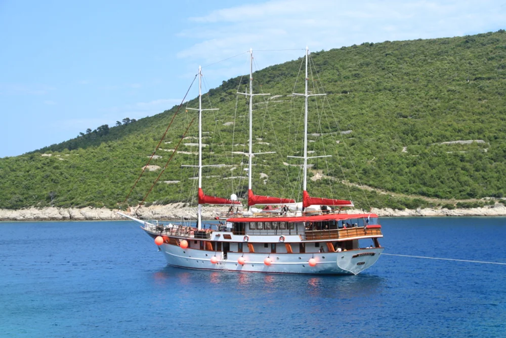 La costa de Dalmacia se extiende frente al litoral adriático de Croacia formando un encantador paisaje costero de extraordinaria belleza. En este entorno mediterráneo único destaca el extenso archipiélago situado entre las ciudades de Dubrovnik y Split. Para recorrer este laberinto de islas y arrecifes, repleto de bahías, playas y pueblecitos tradicionales es imprescindible disponer de barco, un placer que ponemos a tu disposición gracias al yate privado Barbara, reservado exclusivamente para el grupo de Eurovacances. Construido en 2006, el Barbara es un motovelero de 3 mástiles y 41 metros de eslora equipado con dos motores de 380 caballos capaces de propulsar el barco a una velocidad máxima de 12 nudos. Esta preciosa y exclusiva nave, de líneas marineras y elegantes, dispone de 16 confortables cabinas con aire acondicionado y baño privado, dos cubiertas exteriores y un jacuzzi. Su completo equipamiento y su tradicional cocina mediterránea hacen del Barbara el mejor yate privado de la costa dálmata.