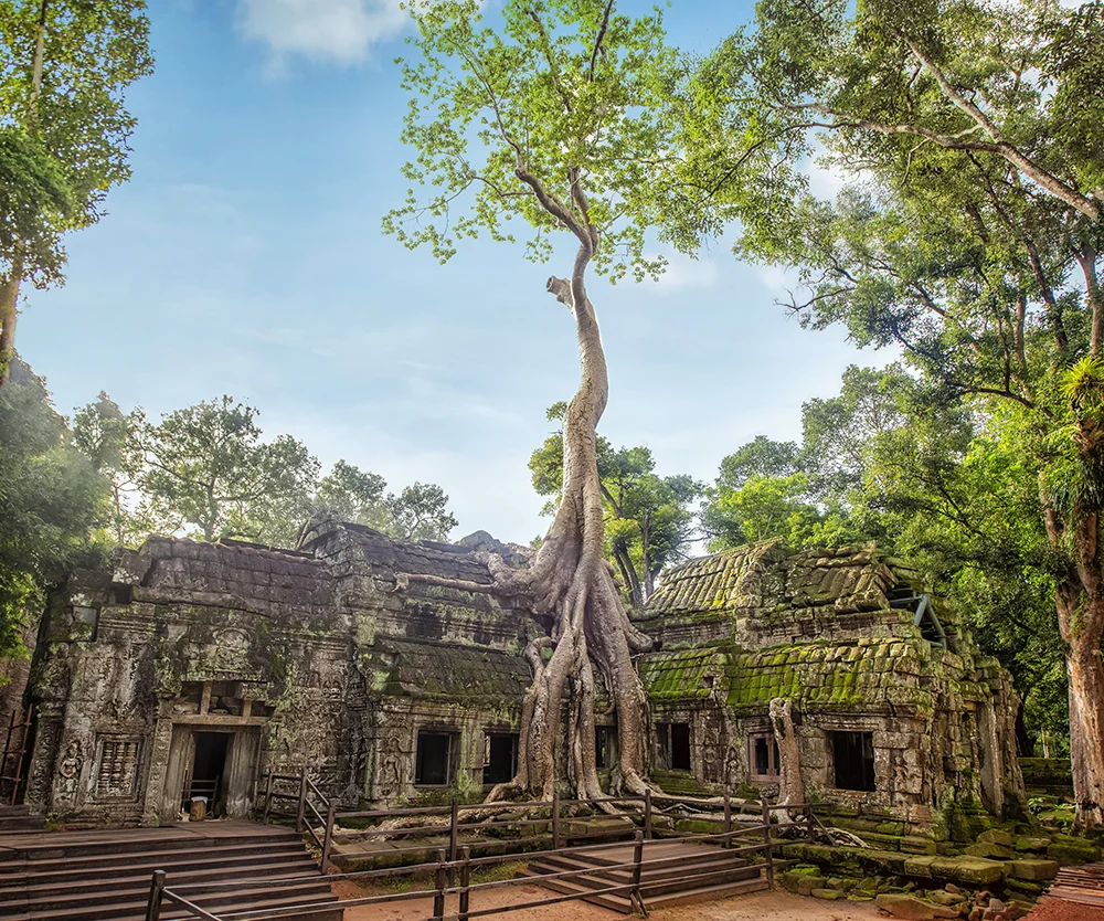 Desayunaremos en el hotel y luego nos dirigiremos a la zona arqueológica de Angkor con los tradicionales vehículos de la ciudad, los tuk-tuk, una forma diferente de conocer la ciudad. Durante el recorrido de la mañana visitaremos el monumental Templo de Bayon, construido durante los siglos XII y XIII y situado en el centro de Angkor Thom. Después visitaremos la Terraza de los Elefantes, de trescientos cincuenta metros de longitud y catorce de grosor, situada en la parte inferior de la sala de audiencias. También veremos el conjunto de Baphuon, una representación piramidal del monte Neru. Acabaremos la mañana conociendo el espectacular templo de Ta Phrom, el único templo con inscripciones de la época, y un ejemplo de cómo la naturaleza engulle con su crecimiento natural cualquier edificio que se ponga en su camino. Volveremos al hotel para almorzar. Esta tarde visitaremos Angkor Wat, el mausoleo que el rey Suryavarman se hizo construir para cuando llegara el día de su muerte. Esta magnífica construcción, considerada una obra maestra del arte khmer, está orientada al oeste porque la tradición khmer afirmaba que occidente era la dirección de los tenebrosos y la muerte. Cuando acabemos la visita regresaremos al hotel y esta noche saldremos a cenar a un buen restaurante local, donde podremos disfrutar de las danzas tradicionales.