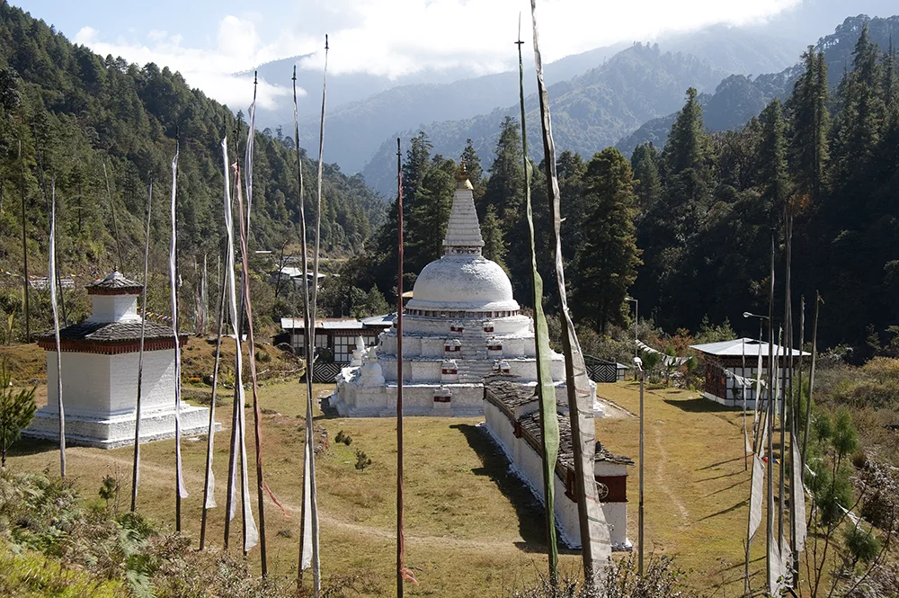 Esta mañana después del desayuno empezaremos la ruta que nos llevará al valle de Gangtey por el pintoresco Yotong-la Pass (3.400 m). Durante el camino, visitaremos el valle de Chhume, hogar del famoso tejido yatra de Bután, que descubriremos. Más tarde visitaremos Trongsa Dzong, el hogar ancestral del monarca de Bután, donde a menudo se encuentran monjes recitando mantras o ensayando música con instrumentos sagrados como trompas, flautas y tambores. También visitaremos el Museo Trongsa que en un inicio fue construido como torre de vigilancia y donde conoceremos la historia del país. Continuaremos nuestra ruta a través de sinuosas carreteras de montaña que atraviesan bosques de encinas para cruzar el collado de Pele-la, situado a 3.300 metros de altitud, límite tradicional entre el este y el oeste de Bután, en la llamada cordillera Negra. Pasado el collado dejamos atrás el bosque de montaña para descubrir un paisaje donde predomina el bambú enano. Gangtey es considerado uno de los valles glaciares más bonitos de Bután y es un área protegida para la vida salvaje. Acabada la travesía nos alojaremos en un lodge del valle de Gangtey donde cenaremos y alojaremos las próximas dos noches.